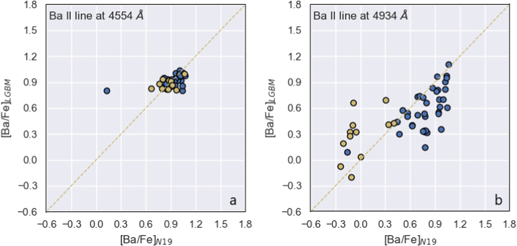 Comparisons of the Ba abundances calculated by our work ([Ba/Fe]LGBM) and values determined from N19 ([Ba/Fe]N19). The yellow line signifies that the predicted value is equal to the target value. The yellow dot represents the point at which ∣[Ba/Fe]4554 Å − [Ba/Fe]4934 Å∣ ≥ 0.5 in N19. The left shows the differences between [Ba/Fe]LGBM and [Ba/Fe]N19 in the prediction of 4554 Å (Ba II), and the right shows these differences in the prediction of 4934 Å (Ba II).