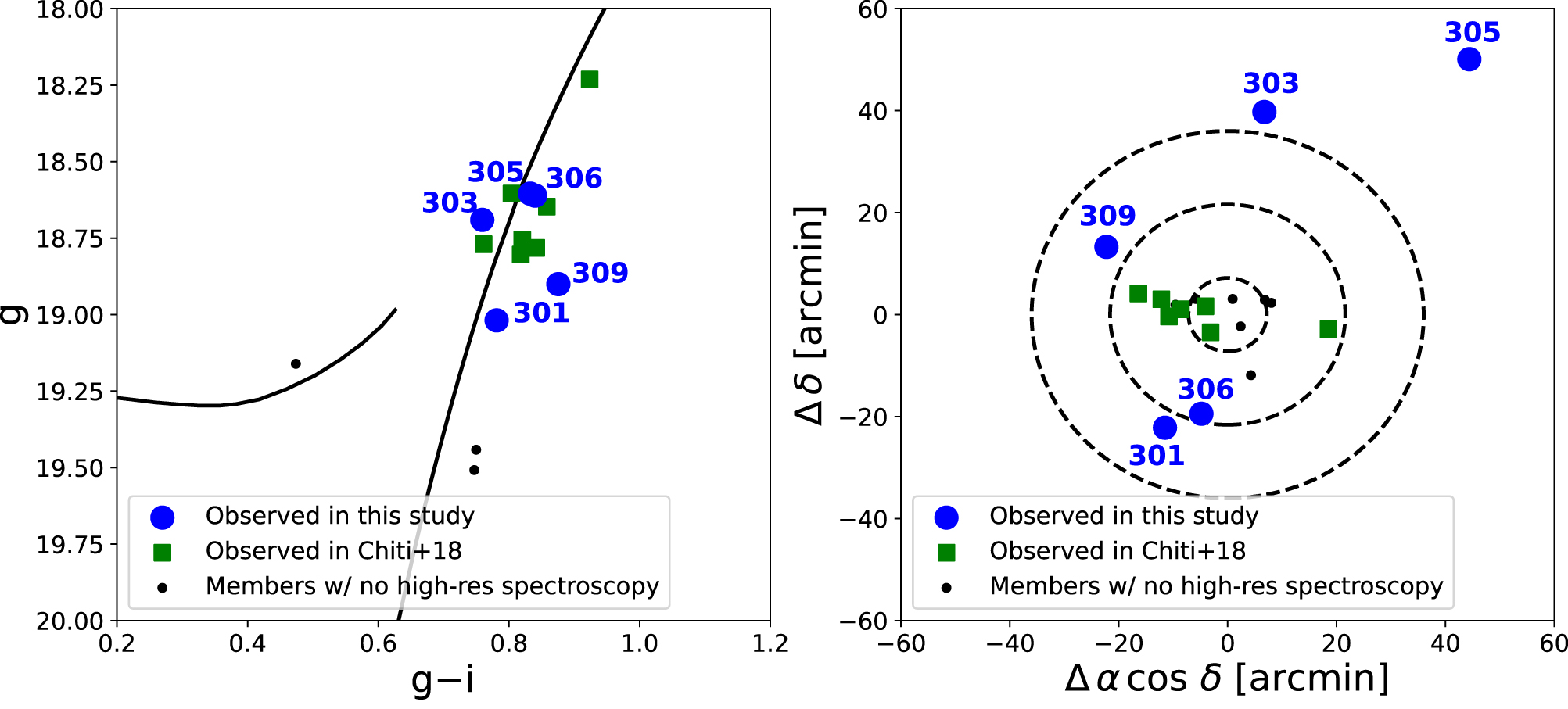 Left: color–magnitude diagram of stars in the Tucana II UFD. Blue circles correspond to stars observed with high-resolution spectroscopy presented in this work; green squares correspond to stars with high-resolution spectroscopy presented in previous works (Ji et al. 2016b; Chiti et al. 2018a); black circles correspond to stars with no high-resolution spectroscopy (Walker et al. 2016; Chiti et al. 2021). A MIST isochrone of 10 Gyr and [Fe/H] = −2.2 (Paxton et al. 2011, 2013, 2015; Choi et al. 2016; Dotter 2016; Paxton et al. 2018) is overplotted at the distance modulus of Tucana II (m − M = 18.8; Bechtol et al. 2015), for reference. Each star observed in this study is labeled by its identifier in Table 1. Right: spatial location of stars with respect to the center of Tucana II. Dashed circles correspond to 1, 3, and 5 times the half-light radius as presented in Bechtol et al. (2015).