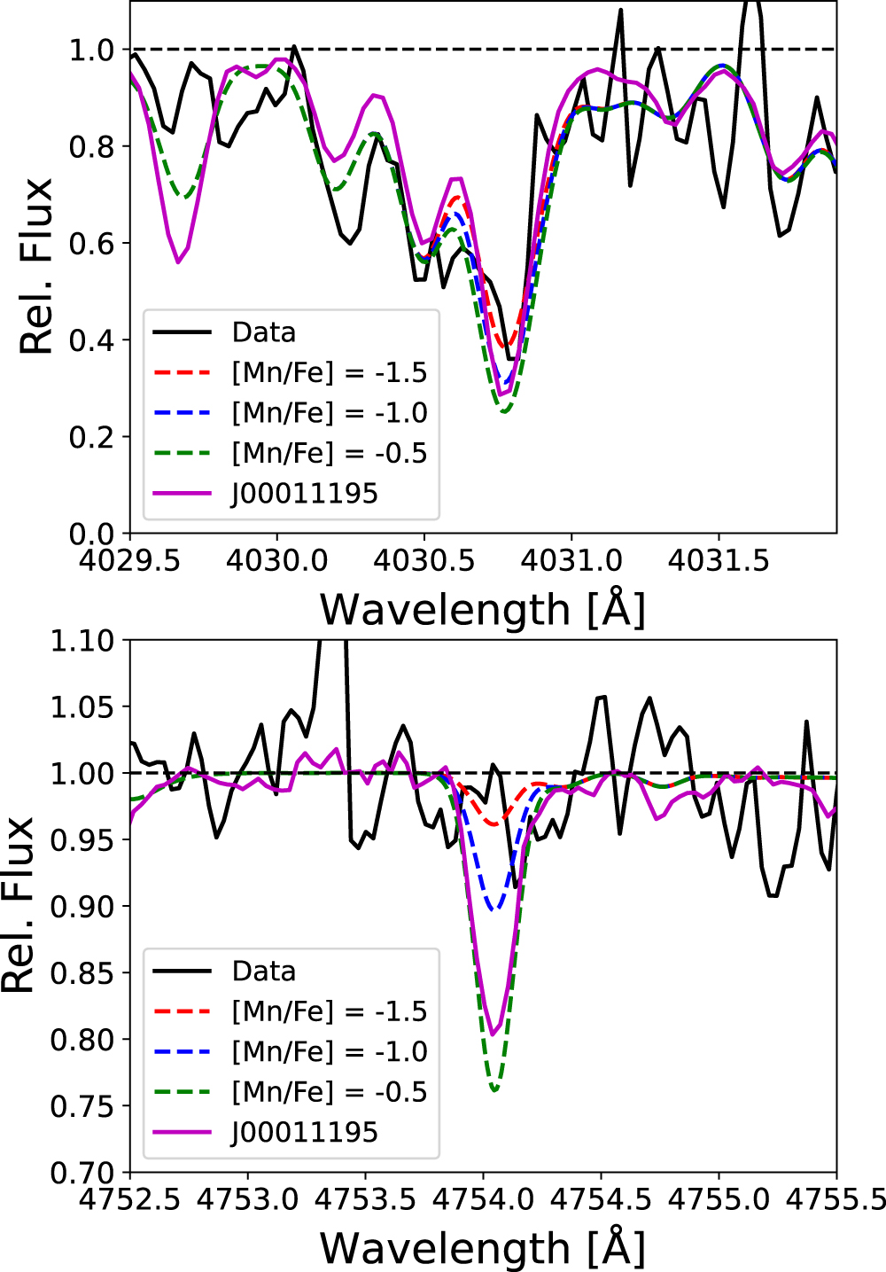 Top panel: spectrum of TucII-309 (black line) around the Mn λ4030.7 absorption feature, with synthetic spectra at [Mn/Fe] = −1.5, −1.0, and −0.5 overlaid along with a reference MIKE spectrum of the metal-poor halo star 2MASS J00011195+0321051 (purple) from Ezzeddine et al. (2020). 2MASS J00011195+0321051 has similar stellar parameters (T eff = 4909 K, ﹩\mathrm{log}\,g﹩ = 1.75, v micro = 1.85, [Fe/H] = −1.99; Ezzeddine et al. 2020) to TucII-309 but a [Mn/Fe] = −0.36, in line with the halo trend (see Figure 4). Bottom panel: same as the top panel, but around the Mn λ4754 absorption feature. The 2MASS J00011195+0321051 Mn λ4754 absorption feature is clearly visible, but the feature is not detected in TucII-309, demonstrating the low Mn abundance of TucII-309. Note that the Mn abundance from the λ4754 feature in Ezzeddine et al. (2020) for 2MASS J00011195+0321051 is [Mg/H] = −2.51, consistent with the above synthesis.
