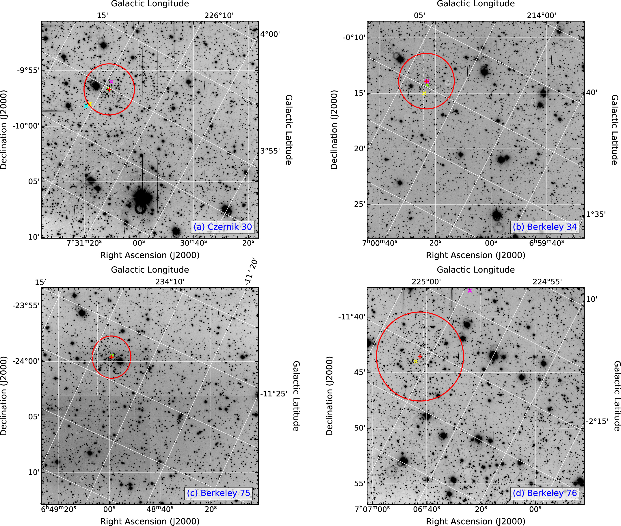 B-band images of the four old open clusters: (a) Czerinik 30, (b) Berkeley 34, (c) Berkeley75, and (d) Berkeley 76. North is up, and east is to the left. The red cross symbols are the centers of the clusters, red circles show the scope of the clusters with the radii determined in this study. The radius for each cluster is shown in Table 2. Other X symbols indicate the centers of the clusters from previous studies (see the text for details).