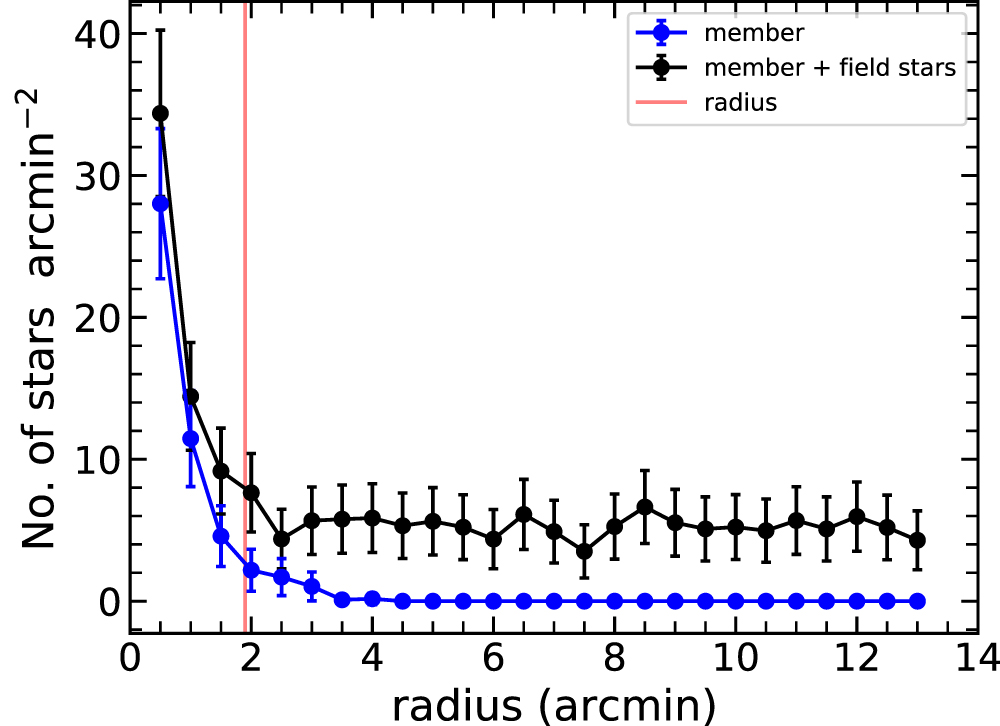 Radial-density profile of Berkeley 75. The black line includes the member stars and the field stars, and the blue line is the radial-density profile of members. The red line indicates the radius of Berkeley 75. The error bars indicate the Poisson errors.