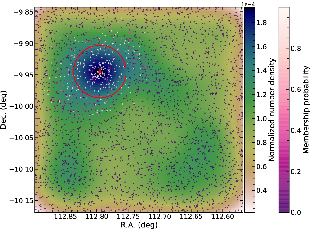 Distribution function of the stellar photometry data from the B-band image including Czernik 30. The color bars on the right show the values of the normalized number density for the background (left) and the membership probability for the colors of dots (right). Black dots are the locations of stars without consideration of their brightnesses, red dot is the obtained center of Czernik 30 and the red circle is radius ﹩2\buildrel{\,\prime}\over{.} 3﹩.