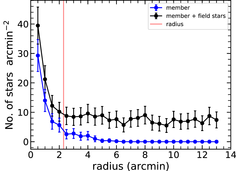Radial-density profile of Czernik 30. While the blue line includes only the member stars, the black line includes members and field stars. The red vertical line is the adopted radius of Czernik 30. The error bars indicate the Poisson errors.
