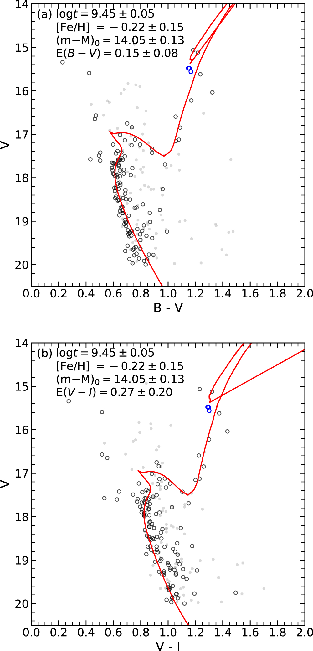 Best fit PARSEC isochrone line on (a) V vs. (B − V) CMD and (b) V vs. (V − I) CMD of Czernik 30. The black open circle symbols are the member stars of Czernik 30, the blue open circles indicate the RC stars of Czernik 30, the gray dots are nonmember stars but located inside the radius of Czernik 30 and the red lines are the best fit PARSEC isochrone model.