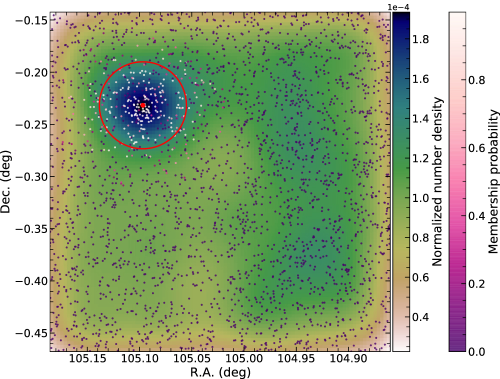 Distribution function of the stellar photometry data from the B-band image including Berkeley 34. Black dots are the locations of stars without consideration of their brightnesses, and the red dot indicates the center of Berkeley 34 obtained from Gaussian fitting. The red circle indicates the radius ﹩2\buildrel{\,\prime}\over{.} 5﹩ of Berkeley 34. The white-magenta dot symbols are the members of Berkeley 34. The left color bar shows values of the normalized number density function and the right color bar the membership probability for each star.