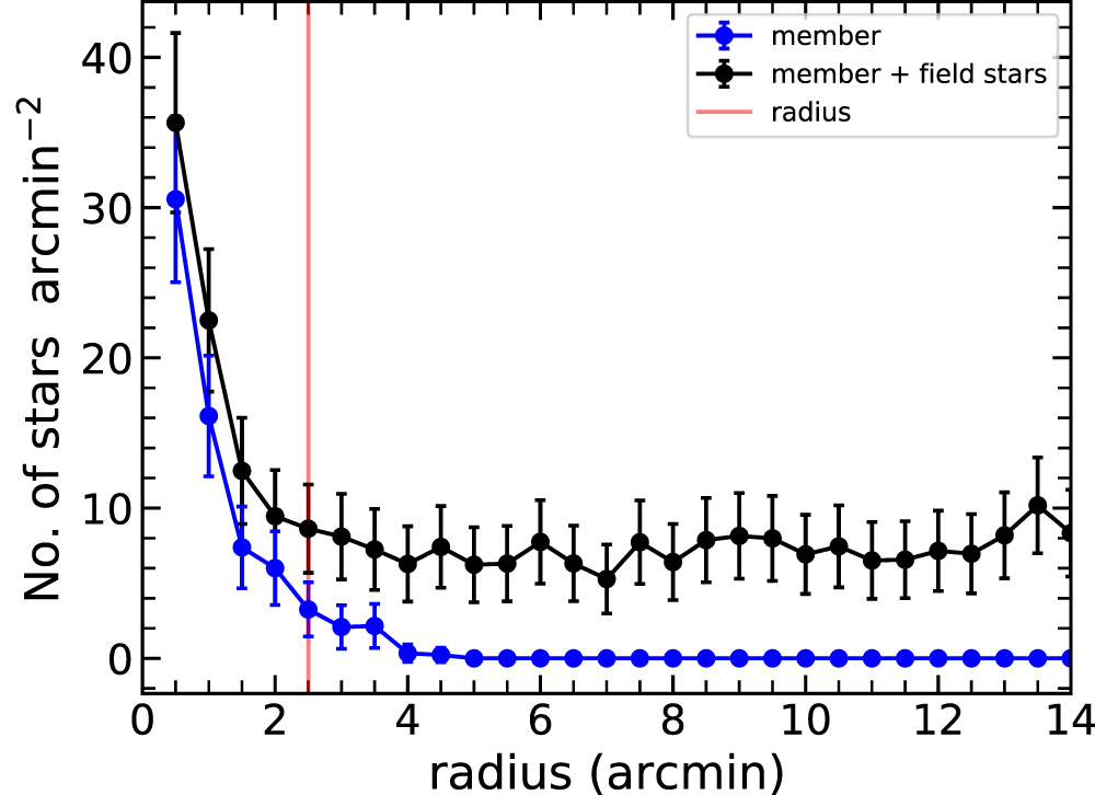 Radial-density profile of Berkeley 34. The black line indicate the radial-density profile of member stars and field stars. The blue line indicate the radial-density profile of member stars. The red vertical line is the radius of Berkeley 34. The error bars indicate the Poisson errors.