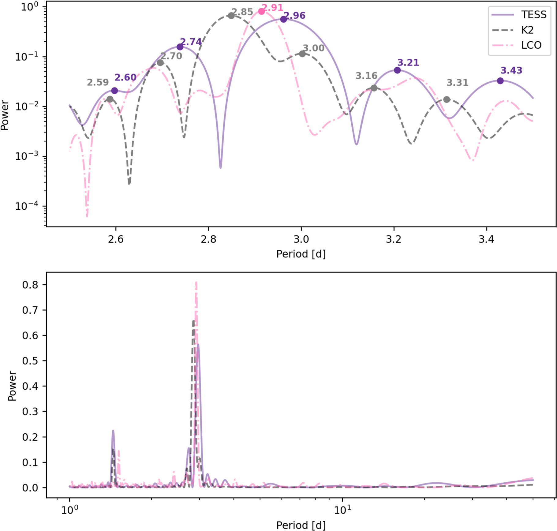 Lomb–Scargle periodograms of the photometric data shown in Figure 9. Top: zoom in on the presumed rotation period, showing several nearby peaks in all three data sets. Bottom: same as the top over a wider period range. Takeaway: multiple closely related periodicities are visible in Fourier space for all three photometric data sets, providing more evidence for differentially rotating active regions.