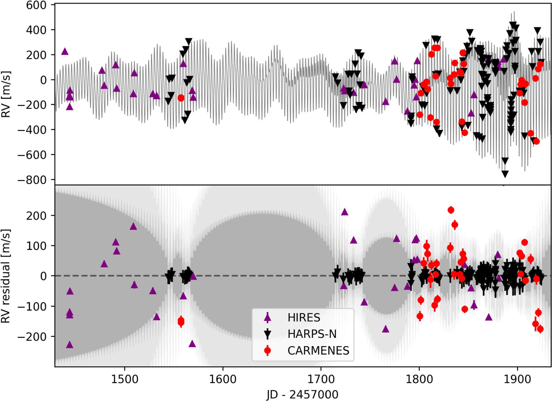 SM21 preferred model prediction and contemporaneous observed data. The HIRES data have been scaled and offset by linear parameters that minimize the residual spread with respect to the GP model, and the median 4pPQP2 CARMENES data RV zero-point value was been applied in order to compare both data sets more easily with the model expectations. Top: mean model prediction (gray solid line), together with contemporaneous HARPS-N (black), CARMENES (red), and HIRES (purple) RVs overplotted. Bottom: model residuals, together with 1 and 2σ GP uncertainty bands (shaded dark and light gray regions, respectively). Takeaway: the preferred SM21 model is overfitting the HARPS-N data, which can be seen in the increased spread about the residual = 0 line for both HIRES and CARMENES data during epochs with contemporaneous HARPS-N data.
