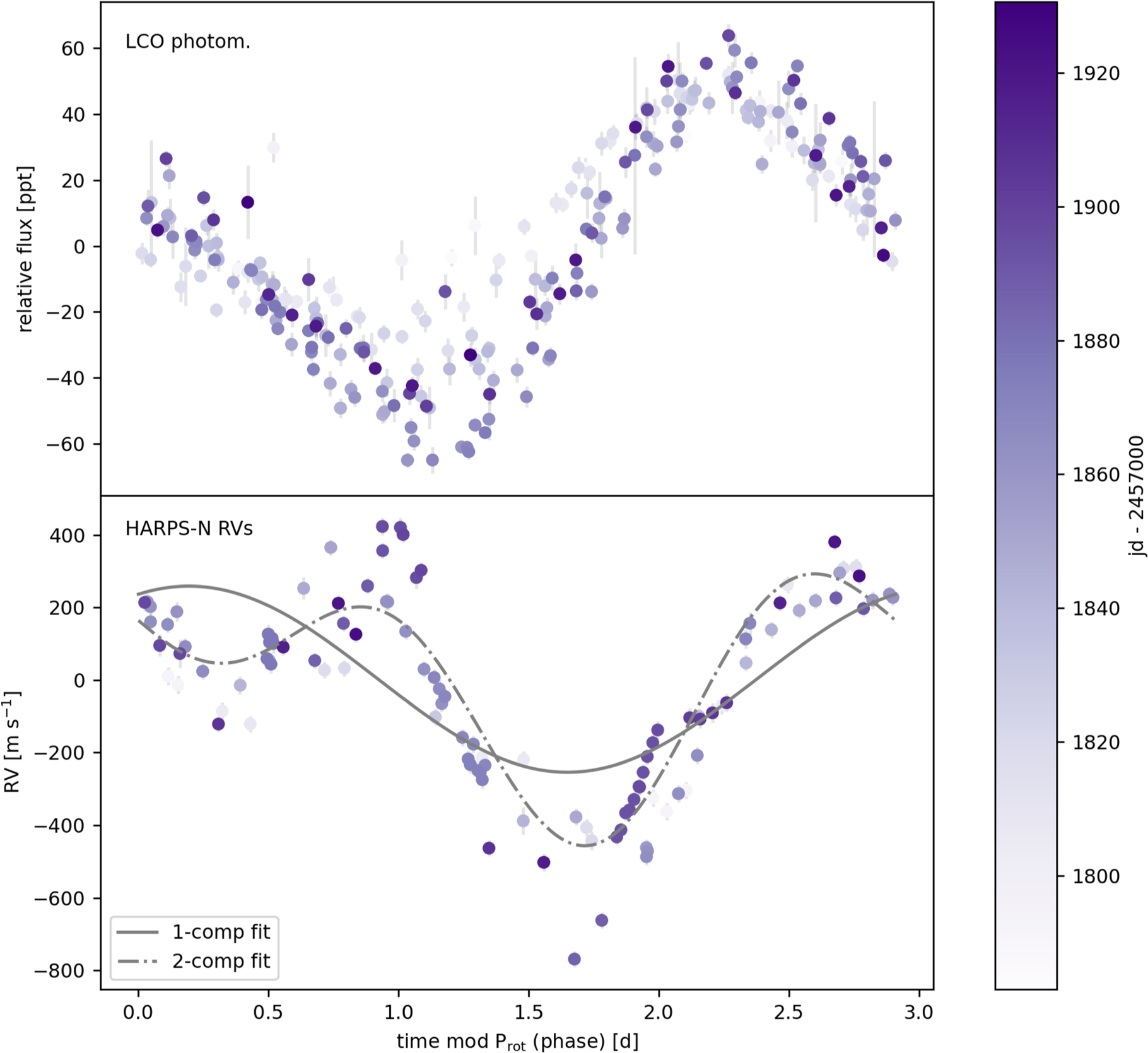 HARPS-N RVs and contemporaneous LCO photometry from SM21, phase folded to the rotation period and colored by observation time. Top: LCO photometry. Bottom: HARPS-N RVs, with fitted jitter values from the preferred SM21 fit added to the error bars. One- and two-component sinusoidal fits are also shown. Takeaway: the presence of a strong periodogram peak at P rot/2 results from the higher-order shape of the RV rotation pattern. This pattern is not present in the LCO photometry, which is approximately sinusoidal over the rotation period.