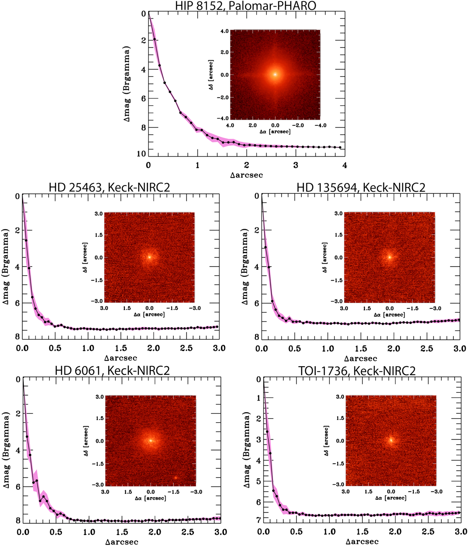 AO imaging results for HIP 8152, HD 25463, HD 135694, HD 6061, and TOI-1736 from our observations with Palomar-PHARO and Keck-NIRC2. Contrast curves are shown in black with 1σ error envelopes in purple. The images themselves are shown as the postage stamp insets. HIP 8152, HD 25463, HD 135694, and TOI-1736 all appear single. Keck-NIRC2 observations of HD 6061 were taken in both Br-γ and J-cont, but only the former is shown here. In the image of HD 6061, TIC 600433892 can be seen in the lower-right corner at a separation of ≈3″. TIC 600433892 is fainter than HD 6061 by 6.2 mag in the TESS bandpass, meaning that its dilution of HD 6061 b’s transits is about a 0.1% effect (i.e., much less than the uncertainty on the stellar radius). HD 6061 and TIC 600433892 have consistent distances and proper motions according to Gaia DR3, meaning that the two stars are almost certainly gravitationally bound. At a distance of 67 pc, their on-sky separation of 3″ translates to a sky-projected separation of about 200 au.
