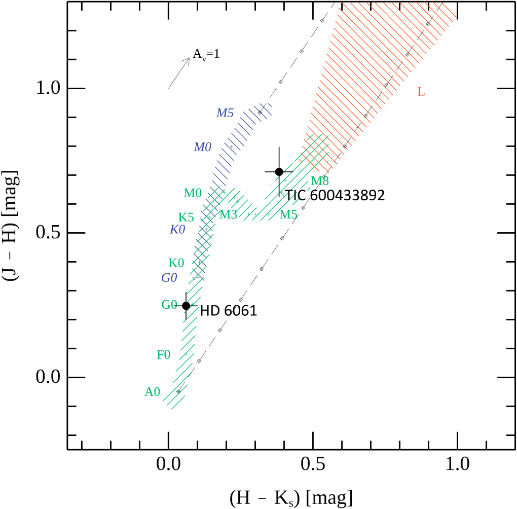 A 2MASS JHK s color–color diagram. The dwarf branch, giant branch, and brown dwarf loci are shown with green, blue, and red hashes, respectively. Black dashed lines represent the direction of reddening induced by extinction (A V ). HD 6061 and TIC 600433892 are overplotted as the black circles with 1σ error bars. TIC 600433892 is consistent with being an M4/5V dwarf. We find that HD 6061 is consistent with being a G0 dwarf, which agrees with the classification from Cannon & Pickering (1993).