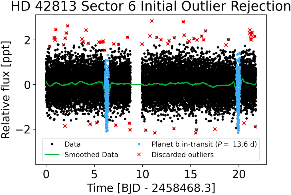 An example of our Savitzky–Golay filtering procedure for HD 42813’s Sector 6 PDCSAP photometry. The black points are the PDCSAP data, the green line is the data after being smoothed by the Savitzky–Golay filter, and the blue points are the in-transit data, which are not subjected to the outlier rejection. Outliers are marked in red.
