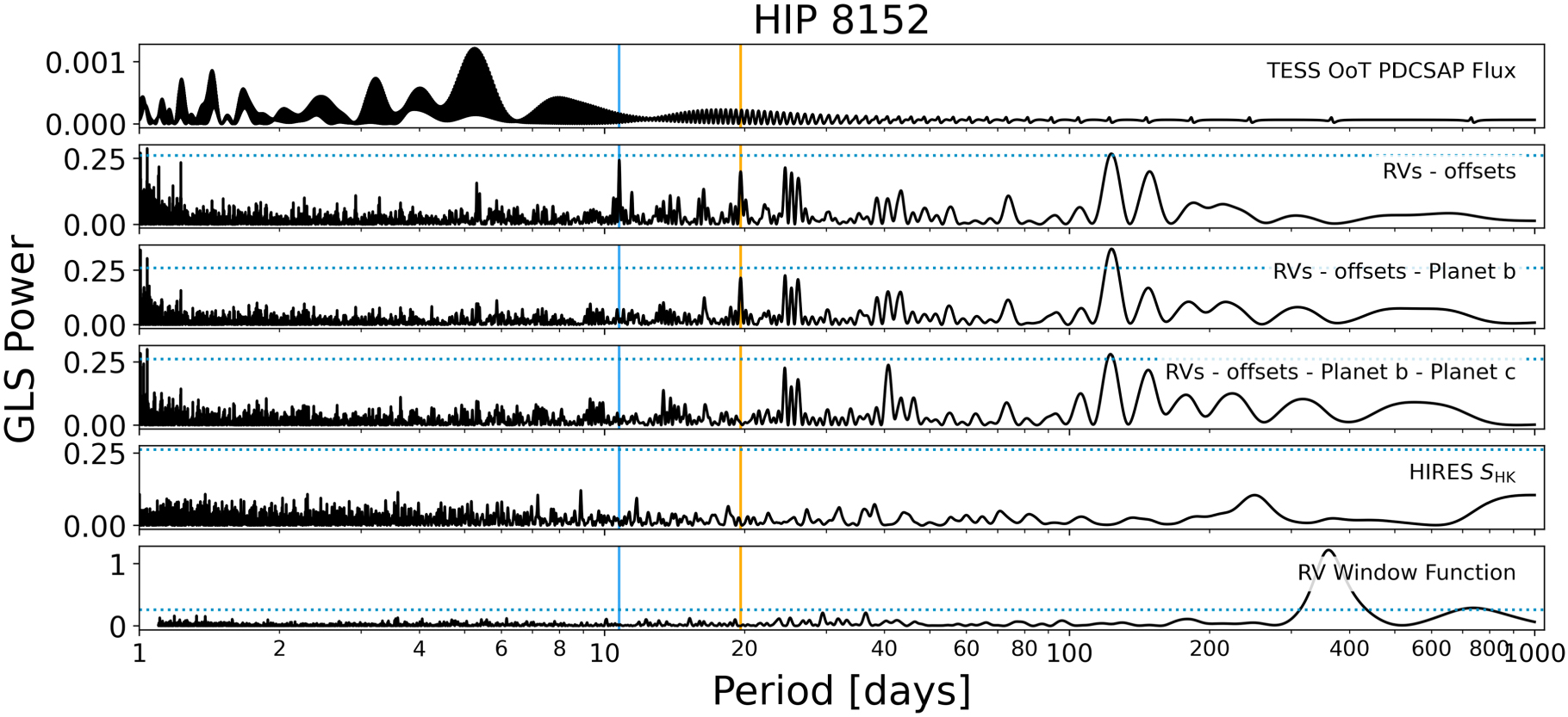 GLS periodograms for HIP 8152 are shown in black. The vertical blue and orange lines mark the orbital periods of planets b and c, respectively. The dashed horizontal line indicates the 0.1% FAP threshold (Baluev 2008). We compute the GLS periodogram of the RV window function with a minimum period slightly longer than 1 day to avoid the strong nightly alias, which otherwise skews the y-axis scale.