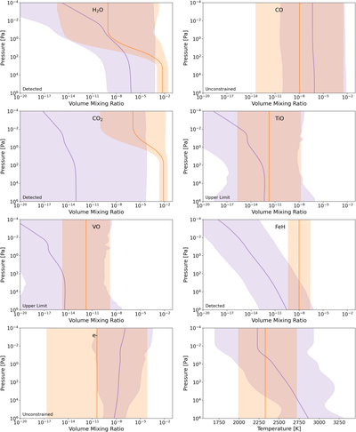 Retrieved molecular abundances from free chemistry (orange) and chemical equilibrium (purple) retrievals. Our free chemistry retrievals suggest the presence of H2O, CO2, and FeH. They also place upper limits on the abundances of TiO and VO but could not constrain CO or e-. The preferred abundance of CO2 is very different between the models, as is the H2O abundance in the lower atmosphere. The retrieved temperature profiles also slightly differ, but are generally within 1σ.