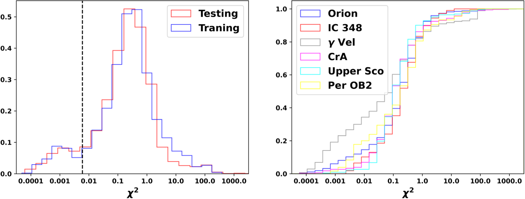 Normalized distributions of χ 2 for our study samples. The left panel shows comparative histograms of χ 2 for the training and testing samples. The dotted vertical line shows the quality cut χ 2 = 0.006, defined as 3σ levels from the minor distribution peak. The right panel shows the cumulative plot of χ 2 per stellar region in the testing sample. The γ Velorum LCs could be more affected by systematic effects than other stellar regions. For example, the quality cut indicates that 30% of γ Velorum LCs are strongly dominated by systematics, while 10% of the LCs in other regions have this problem.