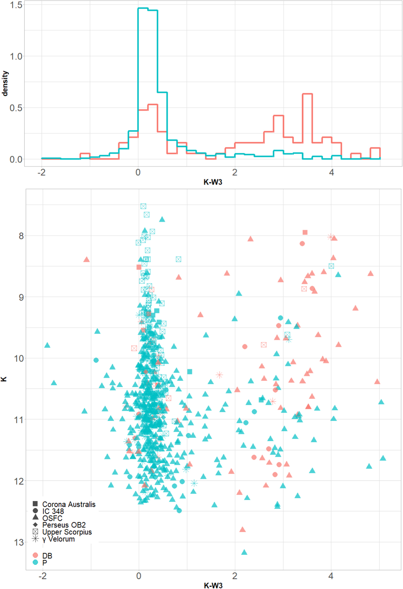 Distribution of 706 candidates to P or DB classes proposed by the algorithm. In the upper panel we have a density histogram of the color of both classes giving an estimation of their probability densities. In the bottom panel we show a color–magnitude diagram using K and W3 bands obtained from the AllWISE catalog (Cutri et al. 2021), and selected to have a profile-fit flux signal-to-noise ratio over 2, and discarding those with possible contamination or bias due to proximity to an image artifact. The number of members in each star-forming region is distributed as follows: 457 stars in OSFC, 112 in Upper Scorpius, 60 in γ Velorum, 49 in IC 348, 19 in Corona Australis, and nine in Perseus OB2. The color–magnitude diagram shows that the behavior of the infrared excess of both classes occurs among all regions we studied.