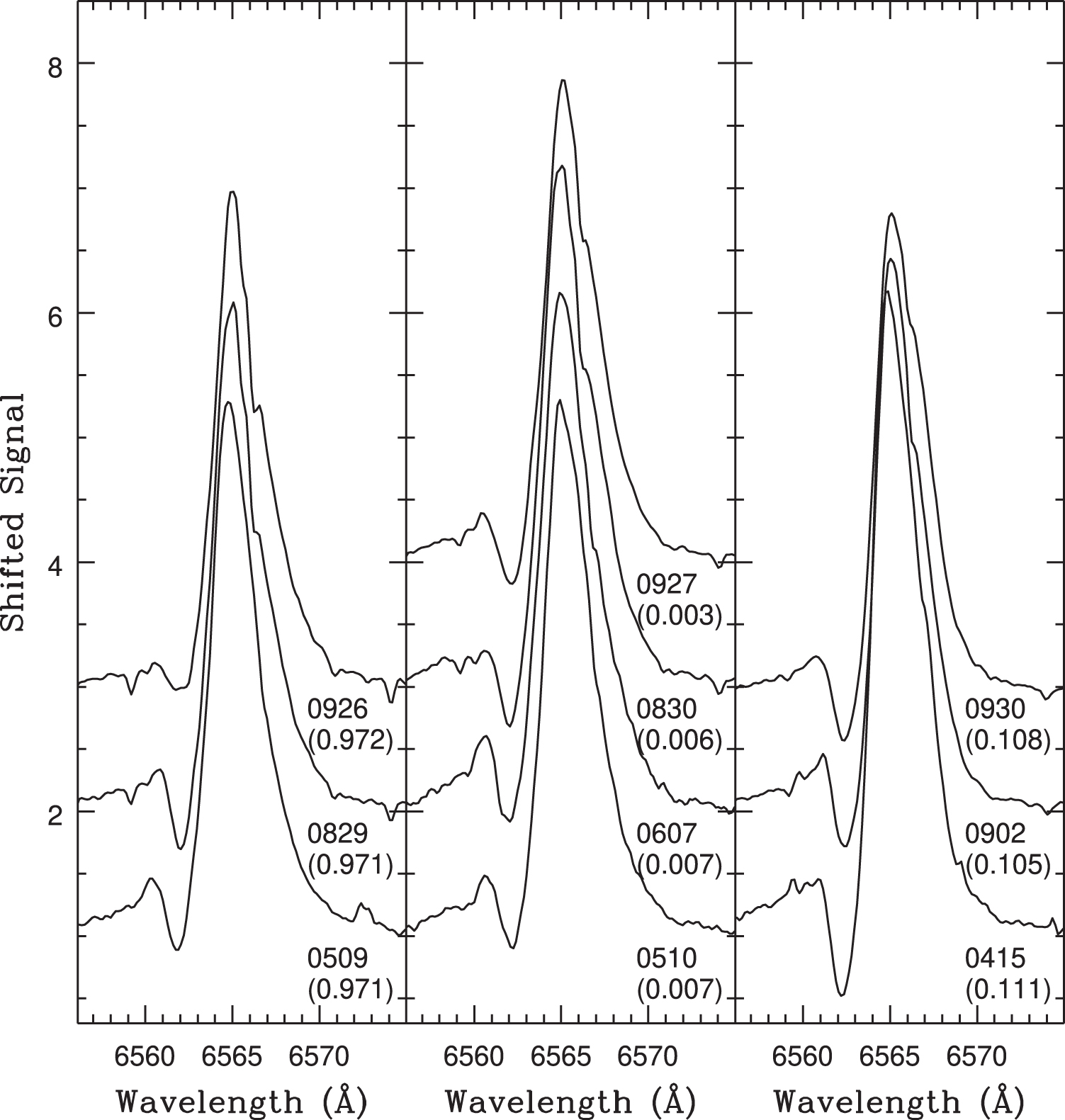 Same as Figure 5, but showing Hα. The overall shape of Hα emission varies with time in each phase interval in a more-or-less consistent manner, in the sense that the red bump appears in spectra recorded after 2022 June. The depth of the trough to the left of the main emission feature weakens with the appearance of the red bump, suggesting that they might be related. The relative height of Hα emission is roughly constant with time in the left-hand panel, and changes only slightly with time in the middle panel. However, significant changes in the height of Hα occur with time in the right-hand panel, in the sense that the peak height of the emission weakens with time. This is accompanied by a decrease in depth of the blue absorption trough.