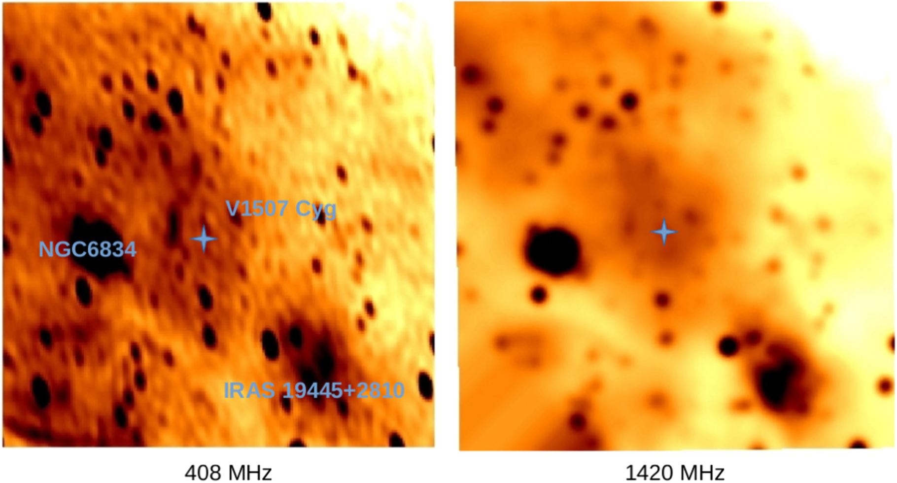Maps of the area around V1507 Cyg at 408 Mhz (left panel) and 1420 MHz (right panel). Both were recorded as part of the CGPS. The 1420 MHz map has been smoothed to match the angular resolution of the 408 MHz map. Each map covers 180′ × 180′, with north at the top and east to the left. V1507 Cyg, marked by the blue star, is at or near the center of a diffuse emission structure that is most obvious in the 1420 MHz map. The intermediate-age cluster NGC 6834 and the diffuse source IRAS 19445+2810, discussed in the text, are also labeled. Neither of these appear to be associated with the H I emission that is centered on V1507 Cyg.