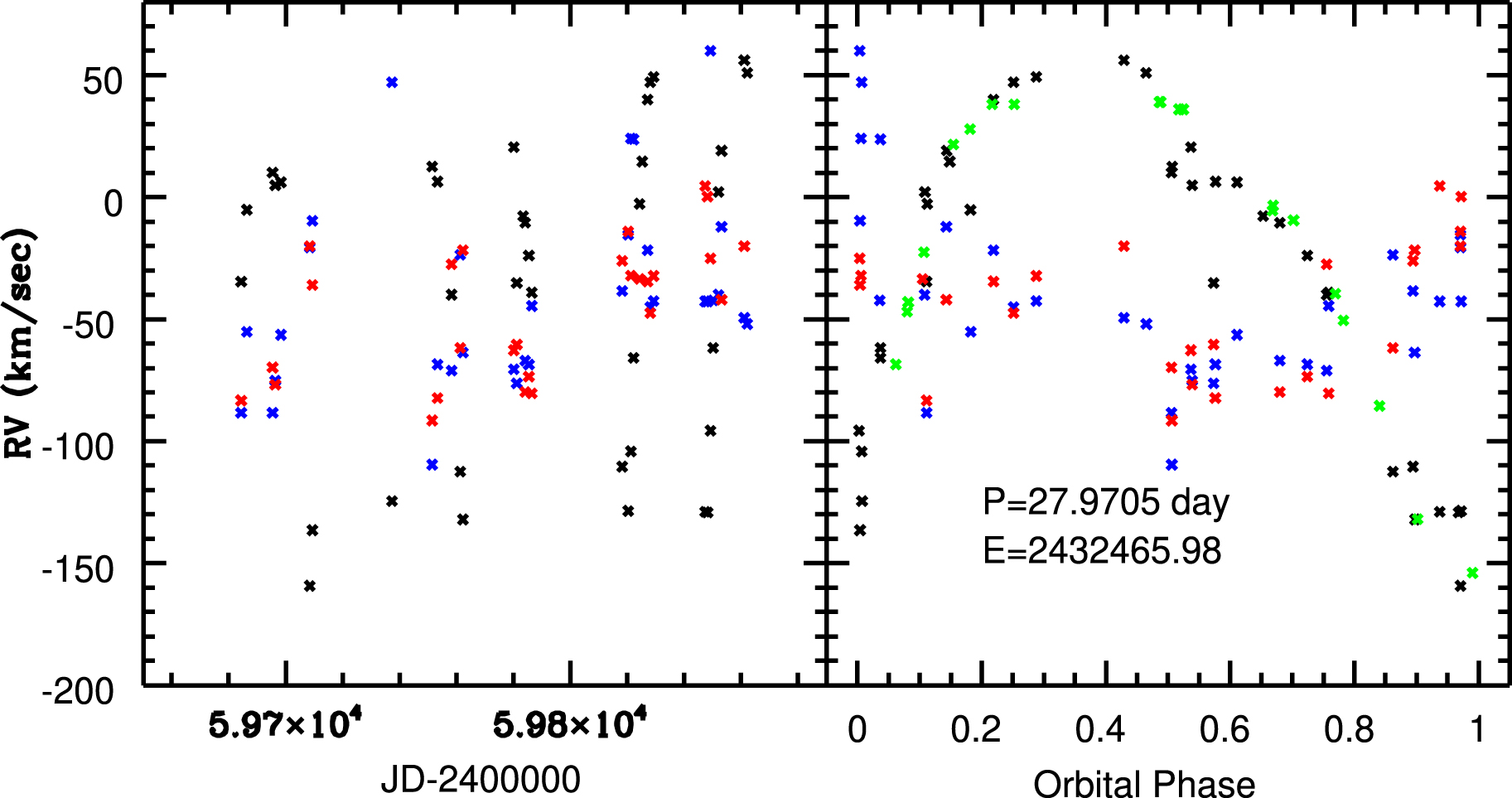 (Left-hand panel:) Radial velocities. Velocities of the brighter star are shown as black crosses, while those obtained from the envelope spectra are shown as blue (He I) and red (Si II emission lines) crosses. (Right-hand panel:) Velocities from the left-hand panel phased using the ephemeris found by Hutchings & Redman (1973). The green squares are the means of the velocities for He I and metal lines listed in Table 1 of Merrill (1949) with phases computed from the Hutchings & Redman (1973) ephemeris. The velocities for the bright star measured from the DAO spectra agree with the Merrill measurements, indicating that the orbital properties of the system have then been stable to within ±10−3% over the time span of a century. That the amplitude of the radial-velocity curve of the bright star is larger than the range in radial velocities obtained from the envelope spectra indicates that the brighter star is less massive than the companion.
