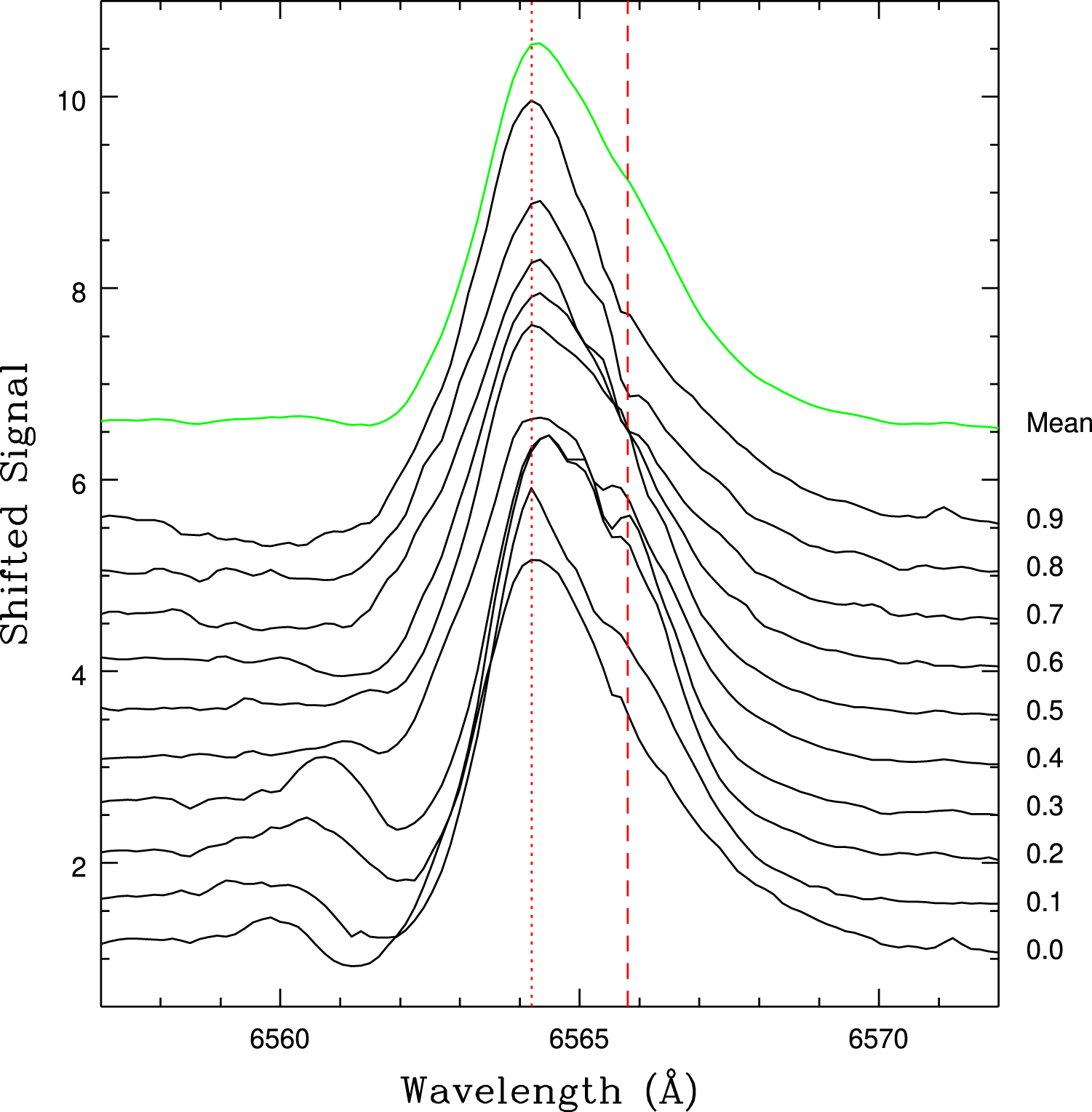Hα profiles in phase-binned spectra. The contribution from the brighter star, which is assumed to have Hα based on the template β Ori spectrum, has been removed. The mean of the profiles is shown in green. The overall morphology of the Hα profile at some phases is similar to what is seen in the spectrum of some Herbig AeBe stars (e.g., Hamann & Persson 1992). The vertical red lines mark the approximate locations of the peak in Hα emission (dotted line) and a second bump that is slightly redward of the main peak that is most clearly seen between phases 0.2 and 0.5 (dashed line). The absorption trough between 6559 and 6560 Å that is present between phases 0.0 and 0.4 is likely due to blueshifted Hα absorption.