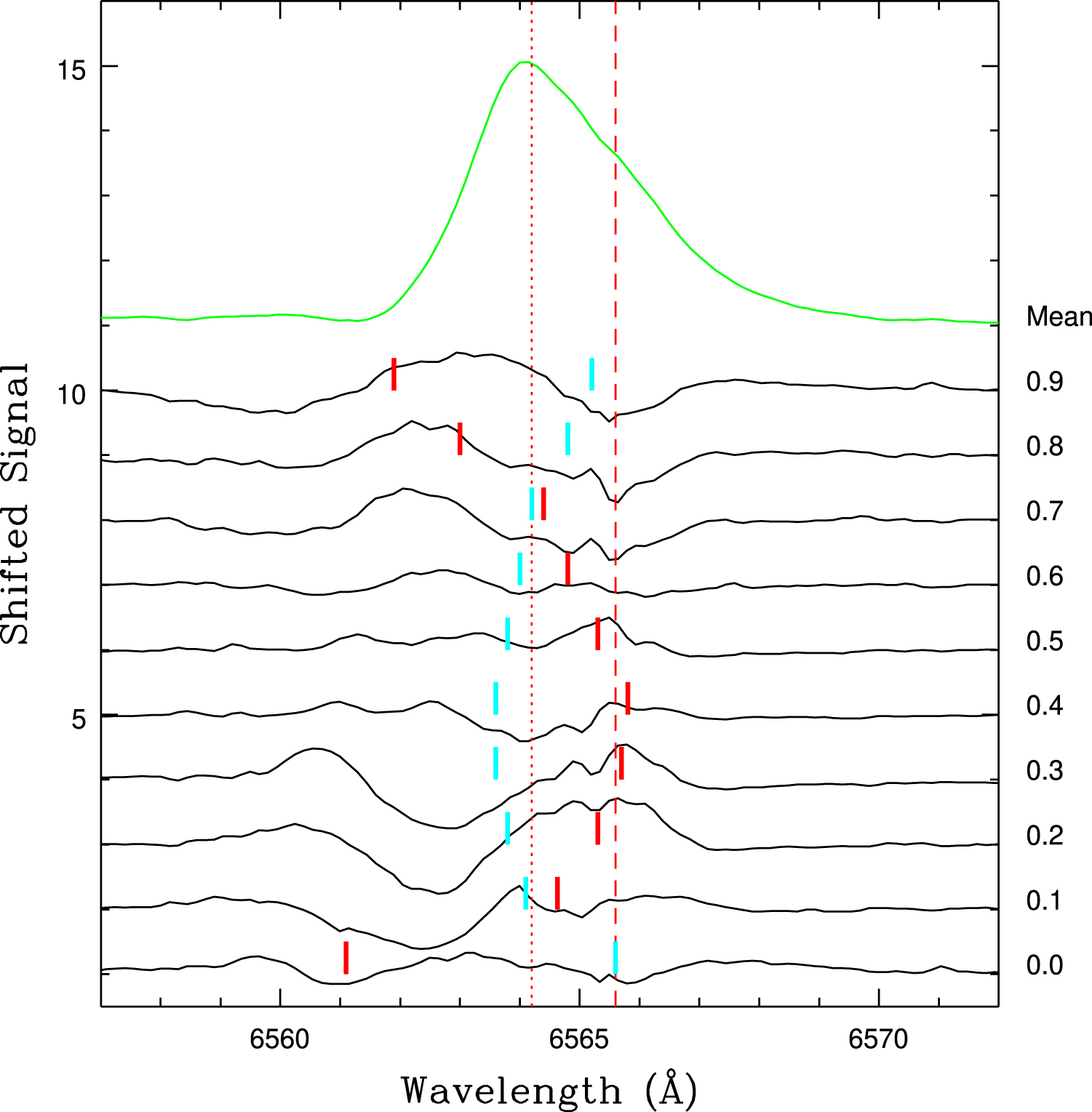Residual spectra that are the result of subtracting the mean Hα profile (shown in green) from the phase-binned spectra in Figure 8. The vertical dotted and dashed red lines mark the same features as in Figure 8. The red hash marks above each curve indicate the expected location of Hα at that phase if it followed the radial-velocity curve of the brighter star. The corresponding cyan hash marks indicate the expected location of Hα based on the radial velocities of the companion, as inferred from the solid line in the middle panel of Figure 7. The peak in the residuals propagates in a manner that is consistent with the motion of the brighter star, as expected if the bulk of the emission is associated with that star.