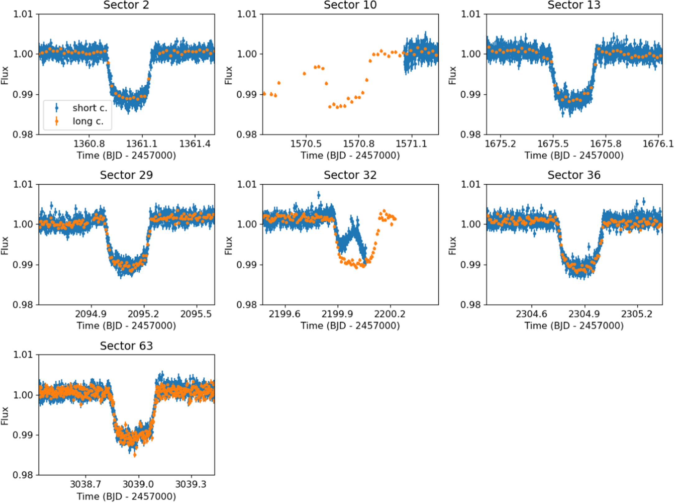 TESS light curves for TOI-199, for the seven sectors with transits. The short-cadence PDCSAP light curves are shown in blue, and the FFI light curves extracted with tesseract in orange. For Sectors 10 and 32 the transits could not be correctly recovered from the PDCSAP light curves.