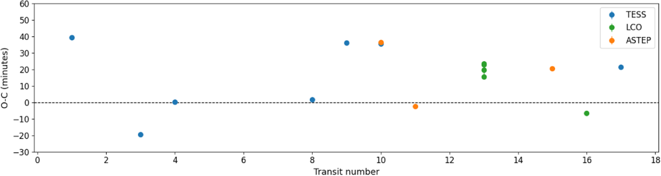 O – C plot (difference between predicted and observed transit midpoint times) for the TESS, ASTEP, and LCO transits. The error bars are generally smaller than the marker size.