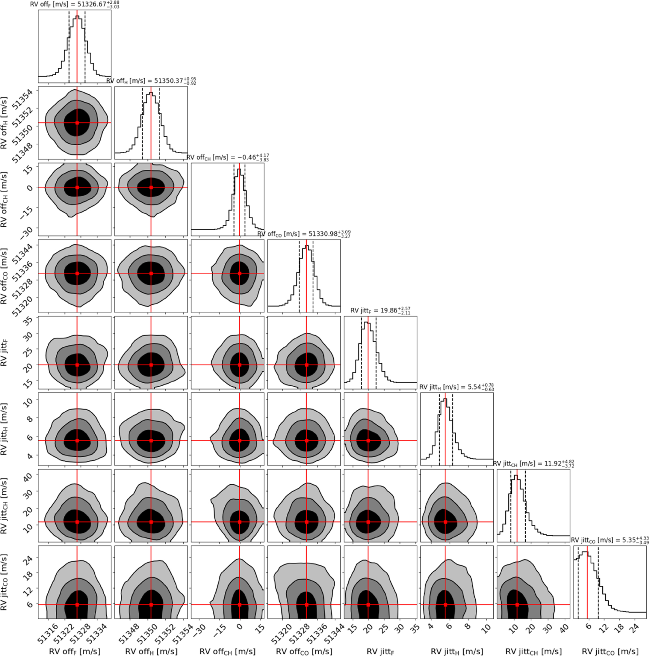Corner plot of the posterior distributions of the instrumental RV parameters for the joint modeling of the TESS and ASTEP TTVs, and the HARPS, FEROS, CHIRON, and CORALIE RVs. The distributions are explored using nested sampling. The red crosses indicate the median values, and the black contour lines the 1σ, 2σ, and 3σ confidence levels. Subindex H refers to HARPS, F to FEROS, CH to CHIRON, and CO to CORALIE.