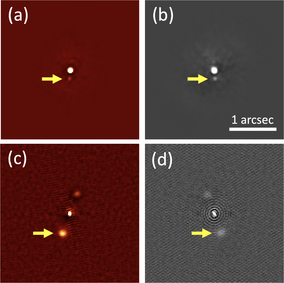 Reconstructed images for two objects appearing in Table 3. (a) The 692 nm image of HR 463, a fifth-magnitude star that we resolve for the first time in this image. (b) The 880 nm image of HR 463. (c) The 692 nm image of KOI-5822, a star with G = 12.91. (d) The 880 nm image of KOI-5822. A scale bar is shown in the lower portion of panel (b), but applies to all four images, and a yellow arrow shows the location of the secondary star. The 692 and 880 nm images appear as mirror images because the 880 nm channel reflects from the dichroic element in DSSI whereas the 692 nm light is transmitted. The images of KOI-5822 exhibit a feature common to our reconstructions of faint objects, where a low-level peak appears 180° away from the primary at the same separation due to low signal-to-noise phase information in the Fourier plane.