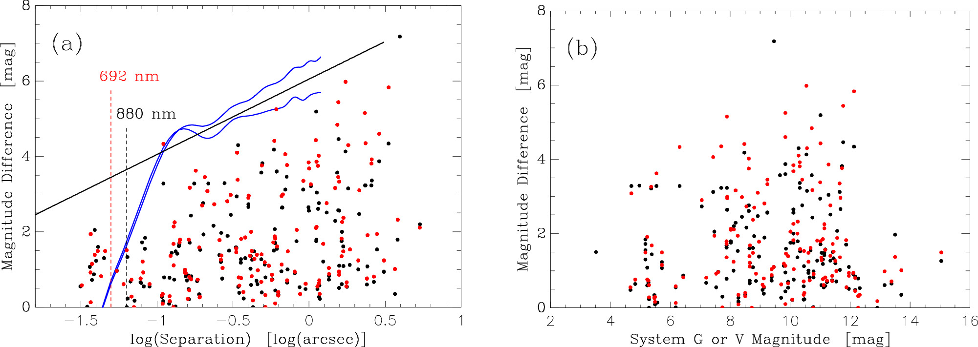 (a) Magnitude difference as a function of separation for all observations from the first year of operation. (b) Magnitude difference as a function of system V magnitude. In both panels, the color of the plot symbol indicates the filter wavelength used for the observation: red is 692 nm and black is 880 nm. Dashed vertical lines show the diffraction limit of the ARC 3.5 m telescope for the corresponding wavelength. In (a), the blue curves indicate typical detection limit curves for APO observations (see Horch et al. 2015 for details on how these are created) and the black line is the estimated detection limit for DSSI on the ARC 3.5 m telescope, drawn such that it roughly matches the blue curves above a separation of 0.″1.