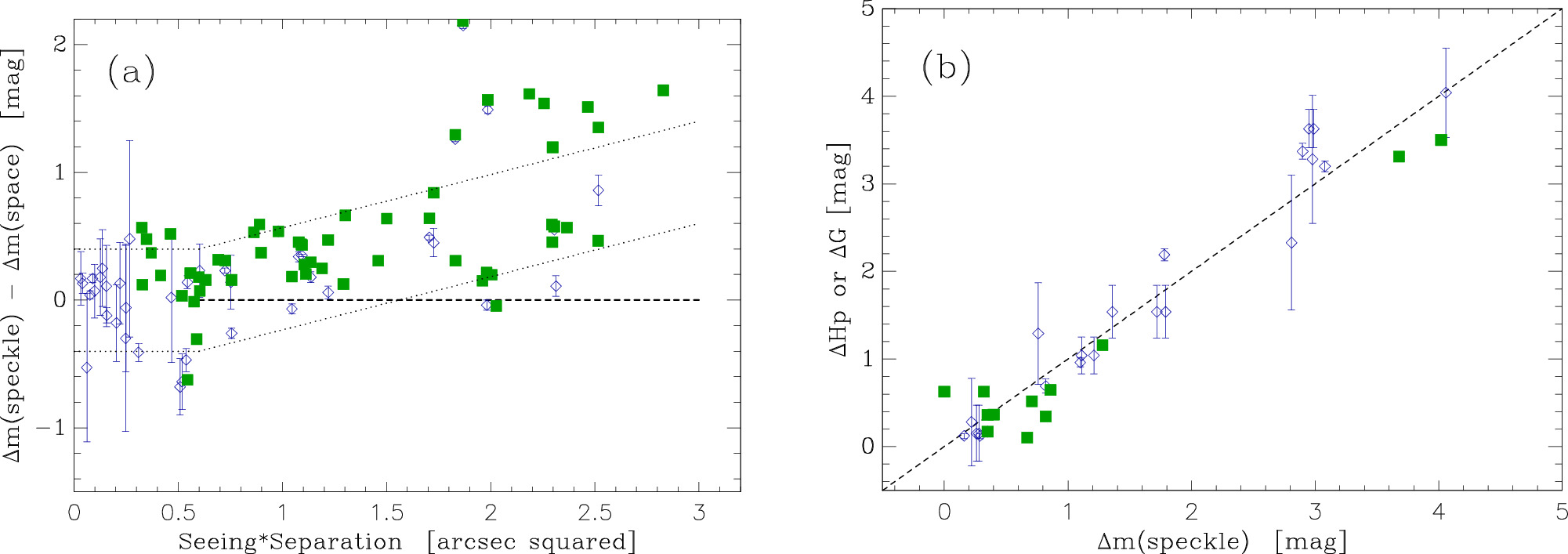 A comparison of photometric results obtained here with those of both Hipparcos and Gaia. (a) Magnitude difference in the 692 nm filter as a function of seeing times separation. The dotted blue lines indicate the approximate range of points in the same plot in our previous paper in this series (Horch et al. 2021). (b) For those systems with seeing times separation less than 0.6 arcsec2, the space-based magnitude difference is shown as a function of the speckle magnitude difference at 692 nm. Here, the dotted line indicates the line y = x. In both plots, the open blue diamonds are derived from Hipparcos data and the filled green squares are derived from Gaia DR3 results. The error bars for Hipparcos points are those stated in the Hipparcos Catalogue, and the errors listed in the DR3 catalog for the Gaia points are typically smaller than the plot symbol.