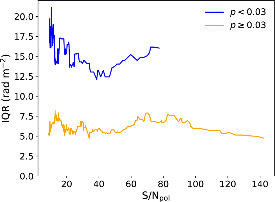 Scatter in RM as measured by the IQR vs. S/Npol for both low (p < 0.03) and high (p ≥ 0.03) polarized fraction components.
