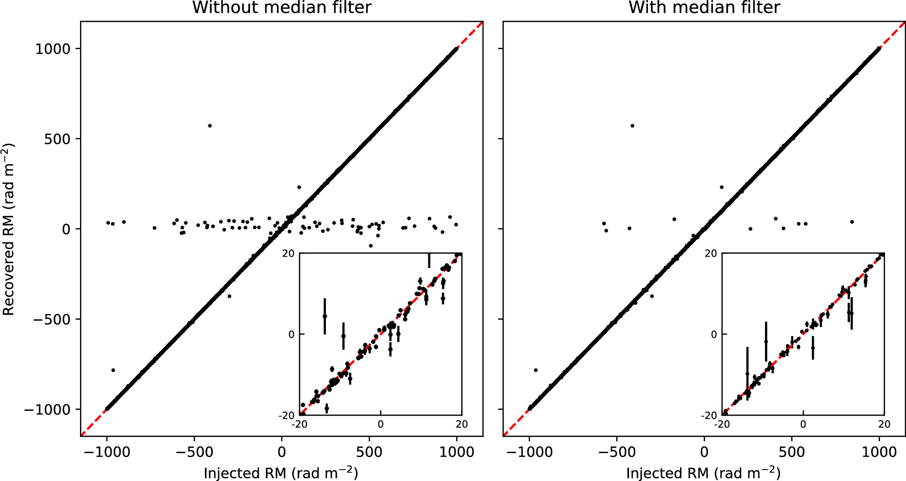 Left panel: recovered RM vs. injected RM for 5000 simulated compact components before applying the median filter. The red dashed line is the one-to-one line. The extreme outliers are components that are fainter than the local foreground diffuse emission. The inset is a close-up of ϕ ± 20 rad m−2. Right panel: same as the left panel but after applying the median filter. There is an 80% reduction in the most extreme outliers and an overall increase in the accuracy of the recovered RMs of all components.