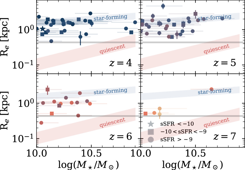 The size–mass distribution of z > 4 massive galaxies presented here. We show the effective semimajor axes measured at rest-frame 0.5 μm (measured in F277W at z = 4 and F444W at z = 7). The points are colored by redshift and the shape indicates the 10 Myr averaged sSFR values from dense basis. The best-fit size–mass relations for quiescent and star-forming galaxies from van der Wel et al. (2014) extrapolated to z = 4–8 are also shown for comparison. The gray line shows the size range of a point source from z = 4 to 7. We find that our sample is primarily star forming and the slope of our sample in the size–mass plane is consistent with the results for star-forming galaxies at lower redshifts, however, they are smaller by a factor of ∼2 than predicted when the relation is extrapolated out to higher redshifts.