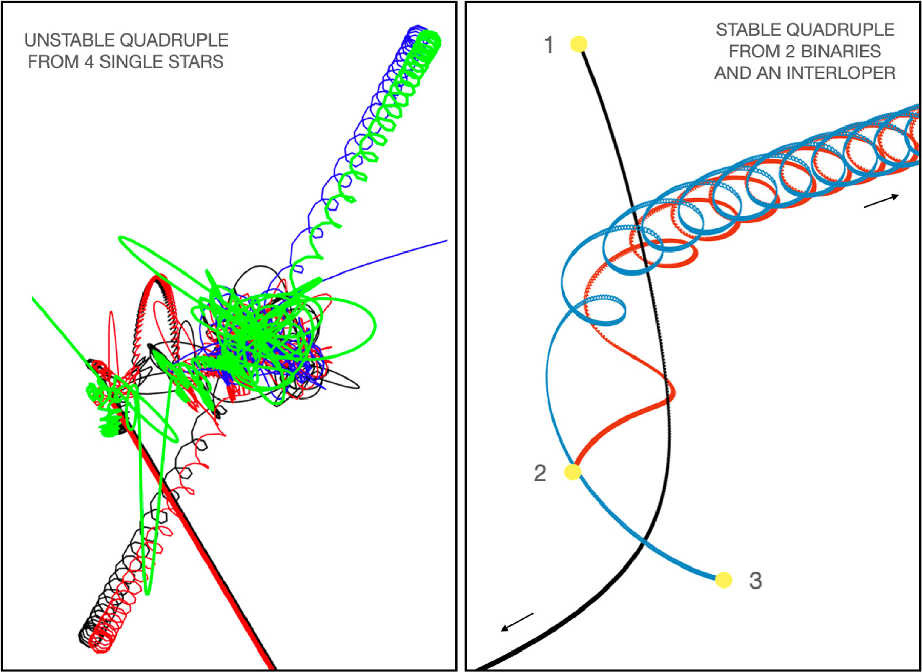 Left: example of chaotic transformation of a nonhierarchical system of four single stars into a temporary 2+2 quadruple (black/red + blue/green), which subsequently breaks up into a binary (black/red) and two single stars (blue and green). Right: example of a nonhierarchical configuration of two primordial binaries (2 and 3) that bind to form a stable 2+2 quadruple system, as an interloper flies by and carries away the excess energy. The formation of a quadruple system is far simpler when the binaries have formed prior to their interaction. Both simulations show the dynamical interactions of point sources without any gas.