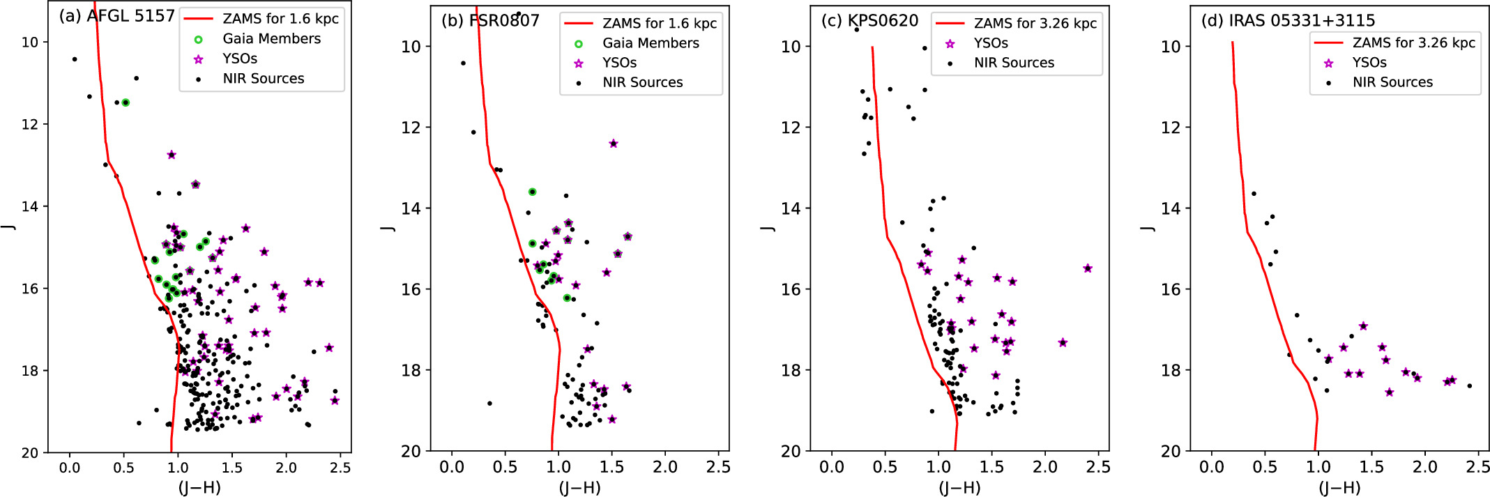 Panel (a): J vs. (J − H) CMD generated using the NIR catalog for the stars within the AFGL 5157 region. The red solid curve defines the ZAMS isochrone by Pecaut & Mamajek (2013), corrected for the distance of 1.6 kpc and A V = 2.24 mag. Panel (b): J vs. (J − H) CMD for the stars within the FSR0807 cluster. The red solid curve defines the ZAMS isochrone by Pecaut & Mamajek (2013), corrected for the distance of 1.6 kpc and zero-reddening. Panel (c): J vs. (J − H) CMD for the stars within the KPS0620 cluster. The red solid curve defines the ZAMS isochrone by Pecaut & Mamajek (2013), corrected for the distance of 3.26 kpc and A V = 2.56 mag. Panel (d): J vs. (J − H) CMD for the stars within the IRAS 05331+3115 cluster. The red solid curve defines the ZAMS isochrone by Pecaut & Mamajek (2013), corrected for the distance of 3.26 kpc and A V = 3.20 mag. The YSOs and Gaia DR3 members are marked in all the panels with magenta asterisks and green circles, respectively. Due to less detection of optical clustering, the Gaia members are not marked for KPS0620 and IRAS 05331+3115.