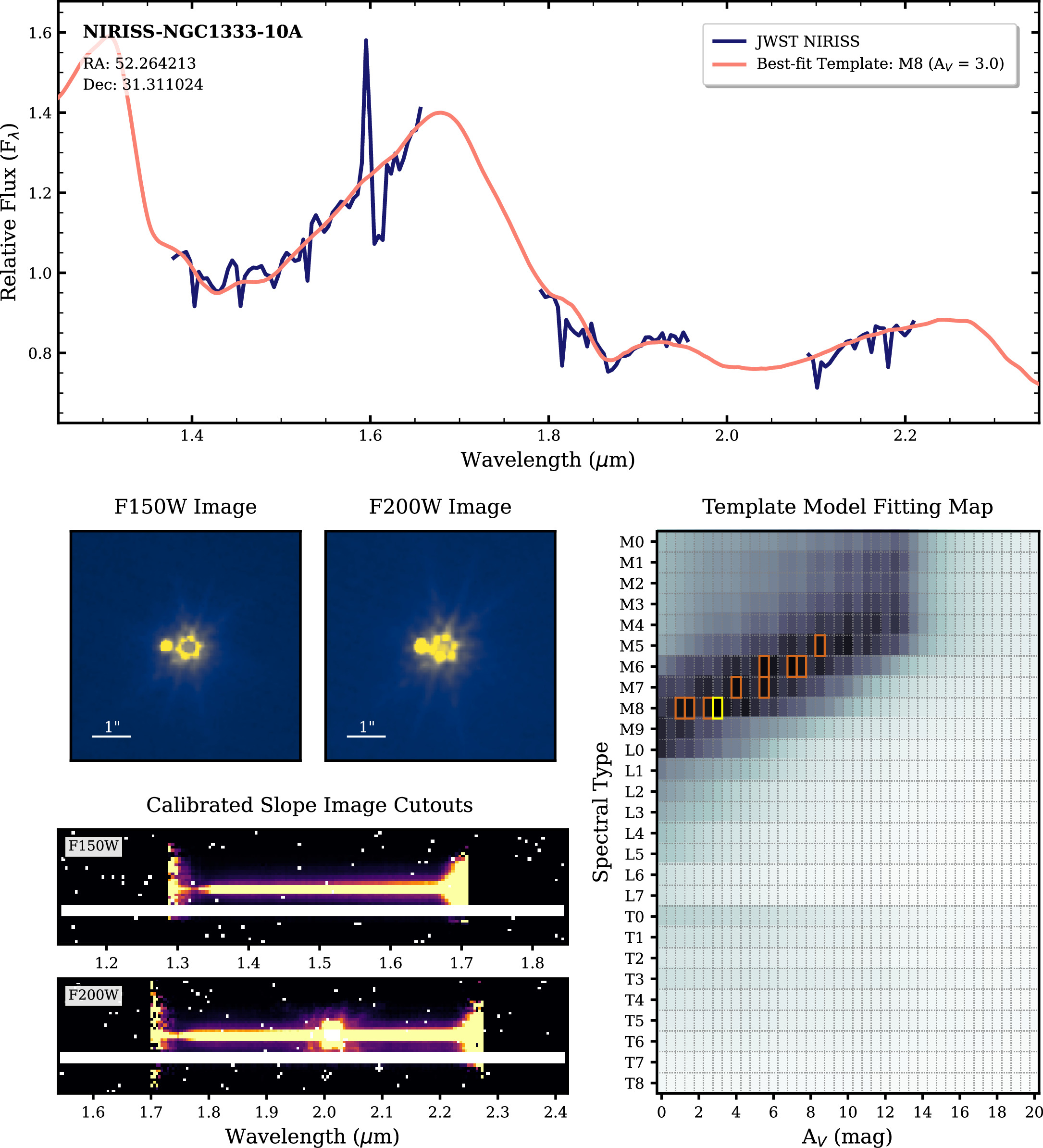 Results of the spectroscopic survey for object NIRISS-NGC1333-10A (NN10A)—the primary object of the binary NN10 (with NN10B shown in Figure 15). Panels shown are the same as in Figure 5. The calibrated slope image cutouts show that there is contamination in the F200W spectrum from a source that overlaps with the spectral trail—the data in this region is unusable and was removed (evident by the gap in the spectrum in the top panel between ∼1.95 and 2.1 μm). The cutouts also display a large white region (where all values are NaNs) to remove the spectrum of the companion object.