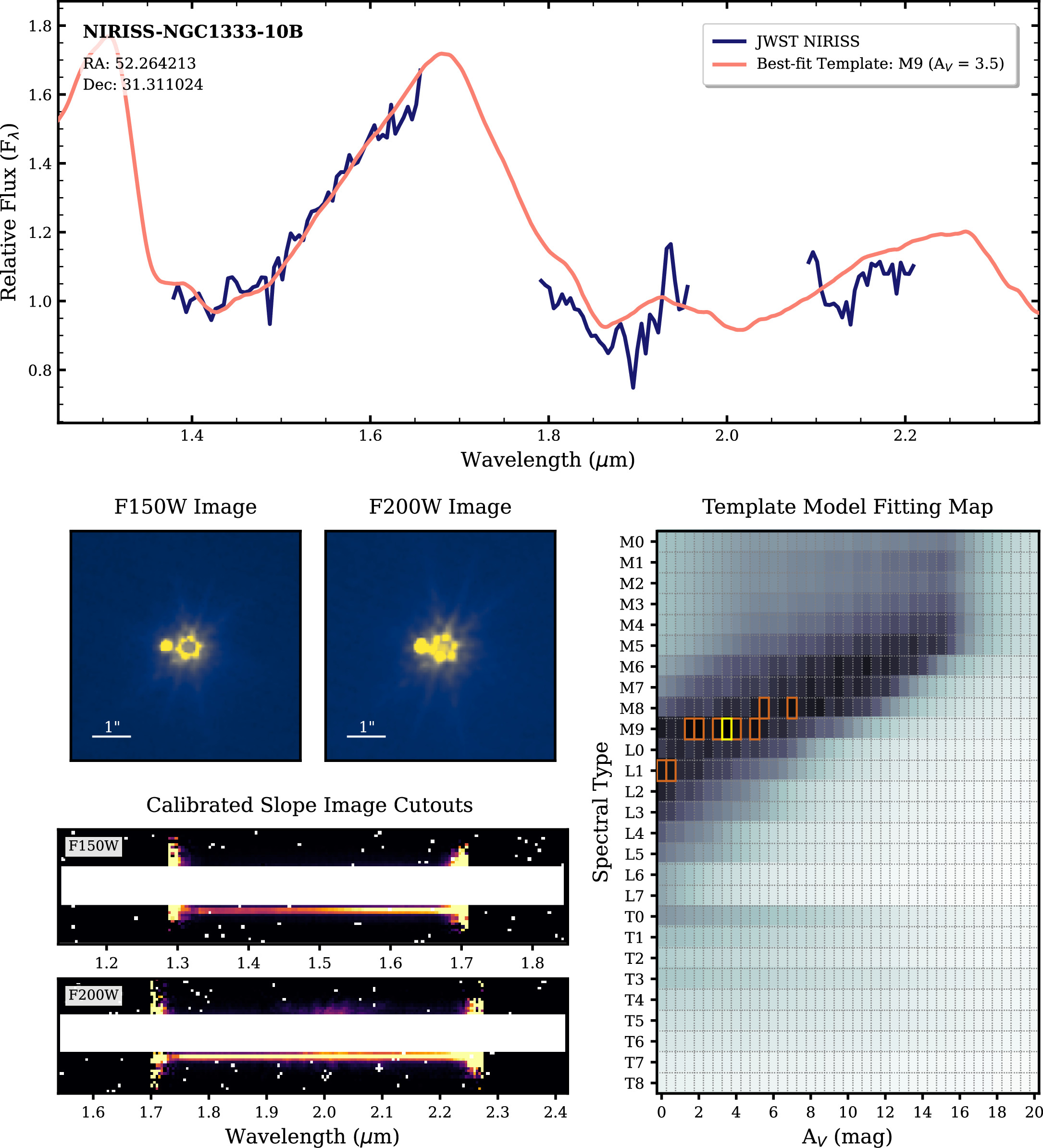 Results of the spectroscopic survey for object NIRISS-NGC1333-10B (NN10B)—the companion object of the binary NN10 (with NN10A shown in Figure 14). Panels shown are the same as in Figure 5. Similarly to NN10A (Figure 14), there is contamination in the F200W spectrum from a source that overlaps with the spectral trail—the data in this region is unusable and was removed (evident by the gap in the spectrum in the top panel between ∼1.95 and 2.1 μm). The cutouts also display a large white region (where all values are NaNs) to remove the spectrum of the primary object.