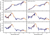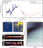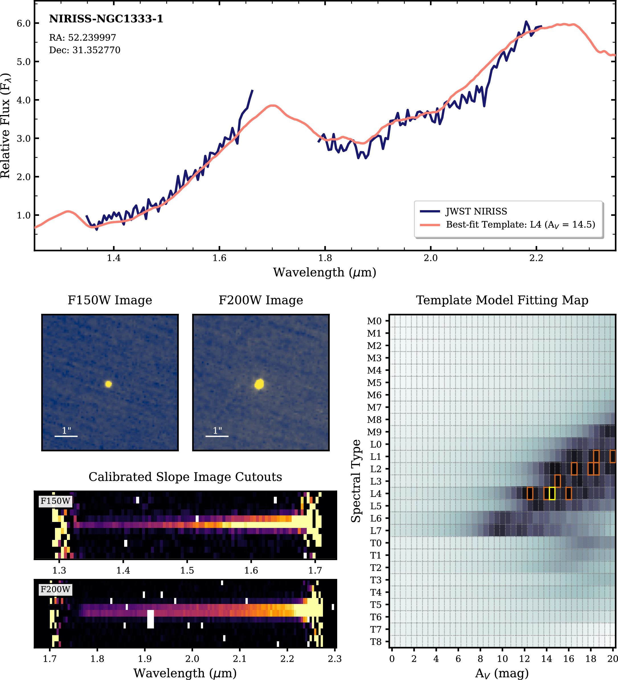 Results of the spectroscopic survey for object NIRISS-NGC1333-1 (NN1). Top panel: NIRISS WFSS spectrum (dark blue) with flux scaled to a value of 1 at a wavelength of 1.4 μm, and best-fit template (salmon pink) from Section 4.2 that has been smoothed using a Savitzky–Golay filter. Middle-left panels: NIRISS images of the object in the F150W and F200W filters with a 1″ scale. Bottom-left panels: calibrated slope image cutouts that are produced by the calwebb_spec3 pipeline for the NIRISS F150W and F200W filters and modified to apply the background subtraction. Bottom-right panel: map of the metric calculated as part of the spectral fitting. The templates that most closely fit the data (having lowest M; see Equation (1)) are located in the darkest regions. The best solution is marked with a yellow box, and the corresponding template is displayed in the top panel to compare to the observed spectrum. The remaining best nine solutions are marked in orange.