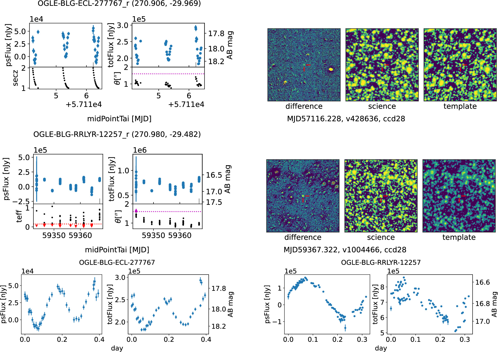 OGLE variables in the Galactic Bulge in the r band: eclipsing variable OGLE-BLG-ECL-277767 (top; P = 0.406 day; 5 s exposures) and RR Lyrae variable OGLE-BLG-RRLYR-12257 (middle; P = 0.318 day; 50 s exposures) with the original light curves (top, middle) and the phase-folded version (bottom; we use the period value from OGLE to shift the data points). For the RR Lyrae variable, after the direct image flux (totFlux) cut mentioned earlier and a cut on significant outliers, in the bottom row we also remove outliers in the difference image flux (psFlux) by using a 3σ cut around the median, and remove data points that have significantly large error bars (1/10 of the light-curve amplitude) to produce light curves cleaner than in the top row. In the difference images, the annular rings around bright stars are mainly caused by saturation, but they do not affect our targets. The observing condition metrics are estimated from the header information of instcal, as these are not included in qcInv. The guider transparency is not available for the top panel exposures, and we give the airmass ﹩\sec (z)﹩ instead; the sky brightness shows a similar trend to the airmass.