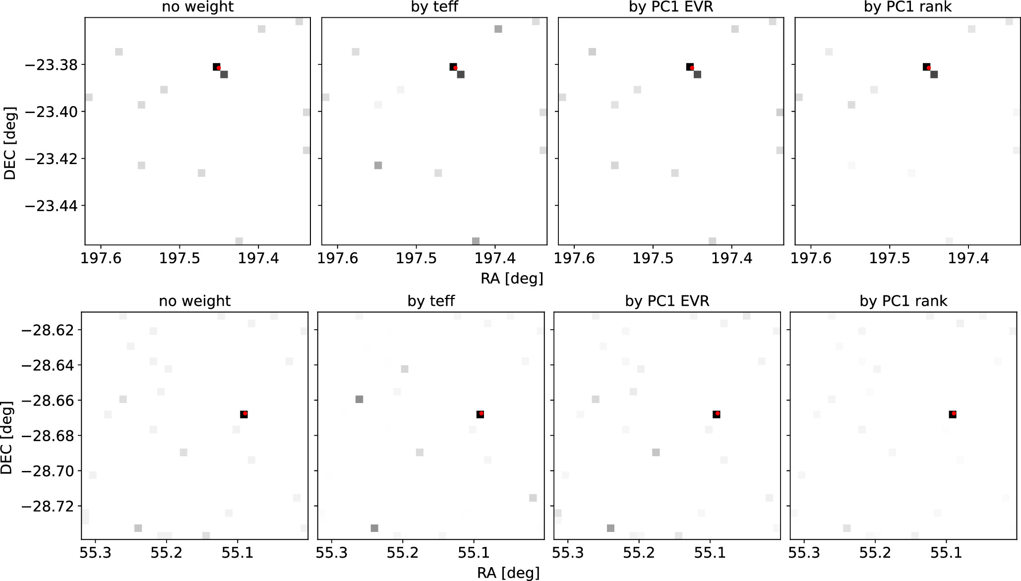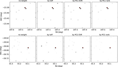 Two-dimensional histograms for PCA selected sources from multiple exposures of the same sky region. The targets are the KN of GW170817 (top row; combining the first four exposures at CCD 36 in the g band) and the DES15C2eaz SN (bottom row; the first nine valid exposures at CCD 18 in the r band). We show the counts with no weight (first column), weighted by teff (second column), by PCA first component EVR (third column), and by first component quantile/rank (last column). In each diagram, a darker color corresponds to a higher count, and the red dot marks the (true) location of the target. Note that there is a possible variable star near the KN. For the SN, if there is only one source after the flag filtering, we set the EVR weight to be zero.