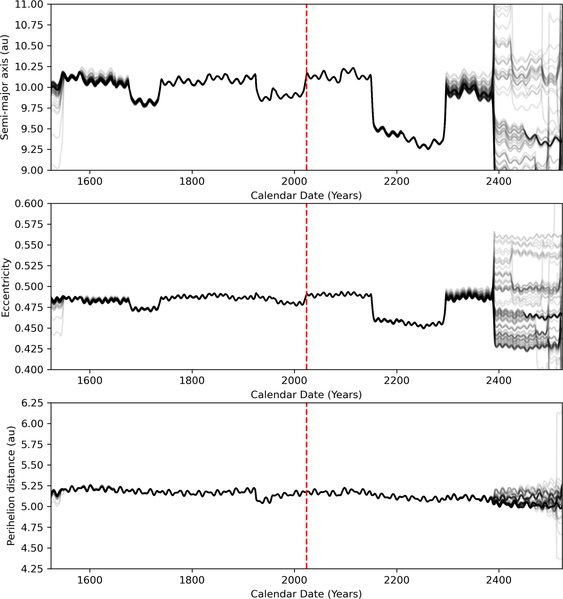 Orbital evolution calculations of the 2023 RN3 nominal orbit and 100 clones. Top panel: semimajor axis a vs. date. The red dashed line indicates the starting epoch of the orbital integrations. The y-axis range of the top panel has been chosen to clearly show the small jumps in a near the current epoch. Middle and bottom panels: as for the top panel, but showing eccentricity e and perihelion distance q.