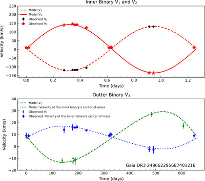 RV fitting for the triple-star system Gaia DR3 249662295687401216. The black points and red stars represent the observed data after phase folding, and the red line indicates the fitted RV curve. The blue points show the velocity of the inner binary's center of mass, while the blue dashed line represents the fitted curve for the inner binary's center of mass velocity. The green points indicate the velocity of the tertiary star, and the green dashed line illustrates the fitted curve for the tertiary star's velocity. V1 and V2 denote the RVs of the primary and secondary stars in the inner binary, respectively, and V3 represents the RV curve of the tertiary star.