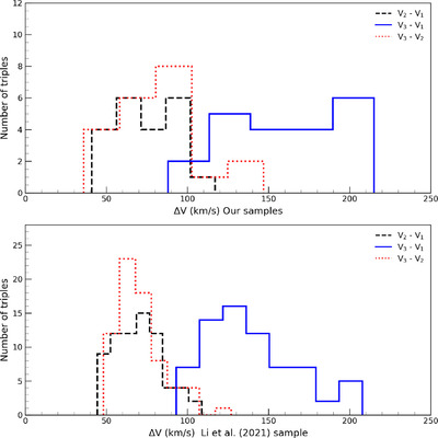 Distribution of the number of ΔVs between any two components in the triples. The three velocities, ordered from lowest to highest, are labeled as V1, V2, and V3. The upper panel shows the ΔV distribution between any two components of the triple-star sample from Section 3, while the lower panel shows the same for the 132 triple-star candidates from C. Li et al. (2021). The black dashed line denotes ΔV between V2 − V1 (ΔV2−1), the red dashed–dotted line shows ΔV between V3 − V2 (ΔV3−2), and the blue solid line indicates ΔV between V3 − V1 (ΔV3−1).