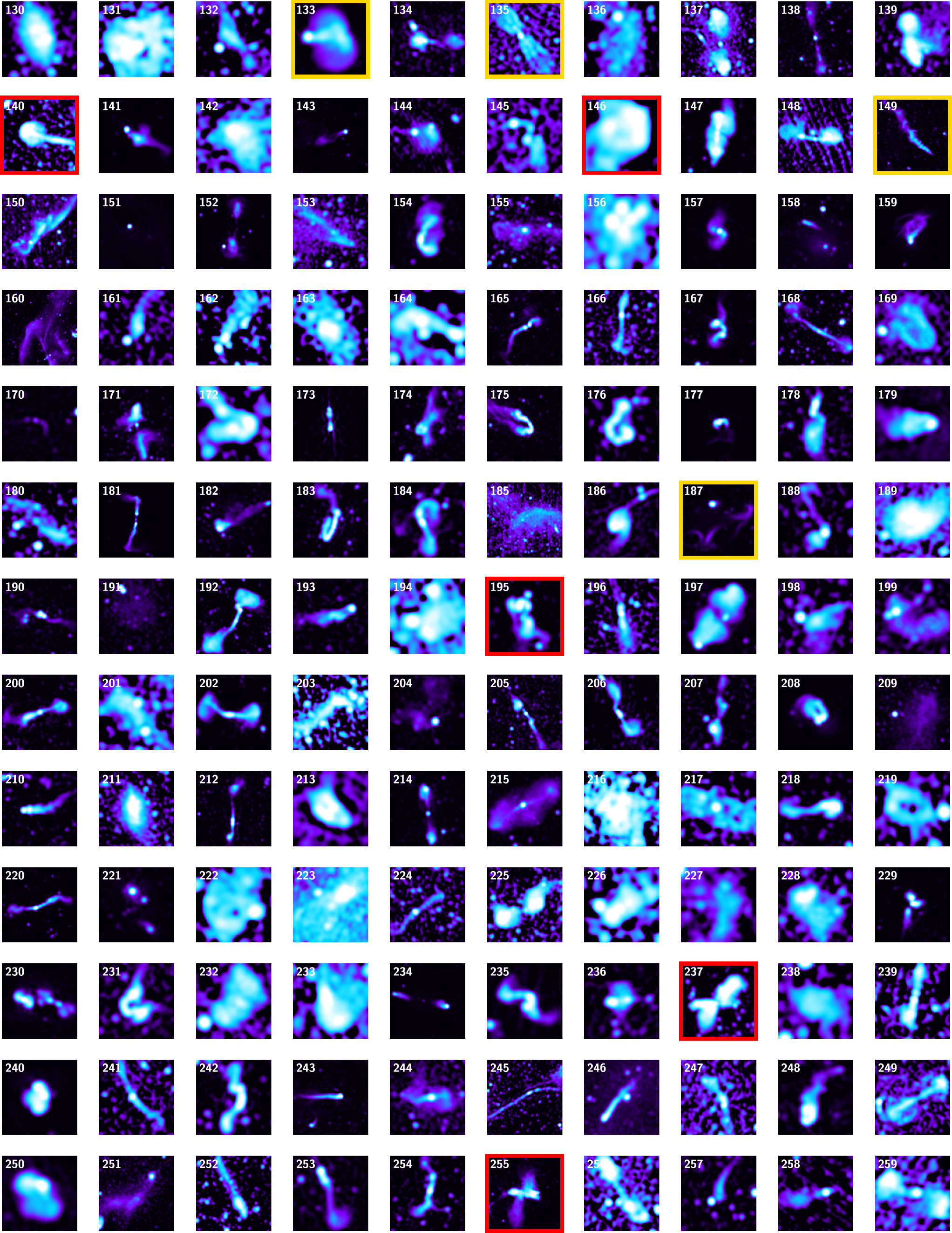 Highest-ranked sources according to PROTEGE. Images have been normalized using an asinh scaling with a threshold at 90%, and the beam size (∼7﹩\mathop{.}\limits^{^{\prime\prime} }﹩6) is indicated with a bar in the lower left. Known sources that have published Figures from K. Knowles et al. (2022) and related literature are highlighted with a yellow border, while new recommendations discussed in the text have a red border.