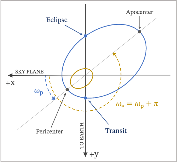 Coordinate system used in the modeling by OrbDot. The positive y-axis points toward the observer, while the x- and z-axes define the sky plane. The planet’s orbit is shown in blue with the argument of pericenter (ωp) measured from the positive x-axis along the direction of motion. The transit and secondary eclipse points are labeled.