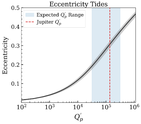 Required orbit eccentricity (e) as a function of the modified tidal quality factor (﹩{Q}_{p}^{{\prime} }﹩) for TrES-1 b, assuming eccentricity tides are the dominant mechanism driving orbital decay. The black curve and surrounding gray region show the eccentricity values needed to match the best-fit decay rate of ﹩-7.{1}_{-1.6}^{+\,1.5}﹩ ms yr−1. The shaded blue region represents the theoretically expected range of ﹩{Q}_{p}^{{\prime} }﹩ for HJs (M. M. Mahmud et al. 2023), while the red dashed line marks the estimated value for Jupiter (V. Lainey et al. 2009). The fact that the required eccentricity (e ≳ 0.2) falls well outside observational constraints suggests that eccentricity tides cannot drive orbital decay.