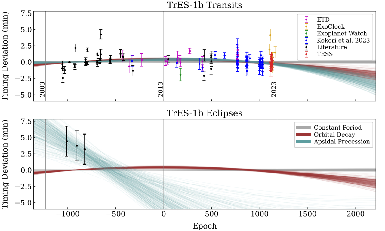 Transit (top) and eclipse (bottom) timing variations for TrES-1 b. Each data point represents the difference between an observed time and the expected midpoint from the best-fit constant-period, circular orbit model. The plot shows 300 random samples from the weighted posterior distributions of the joint model fits—which included RV data—for the constant-period, orbital decay, and apsidal precession models.