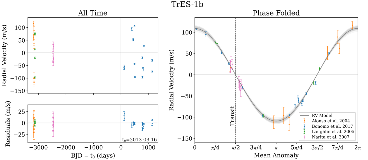 RV data and best-fit orbital model for TrES-1 b. Top left: RV measurements over time, with data points shifted by the systemic RV and observation times shifted to the reference time, t0. Bottom left: residuals obtained by subtracting the best-fit RV model from the data. Right: phase-folded RV measurements plotted against mean anomaly, with 300 random samples from the model posterior shown in gray to represent model uncertainty. Data sources are color coded as indicated in the legend.