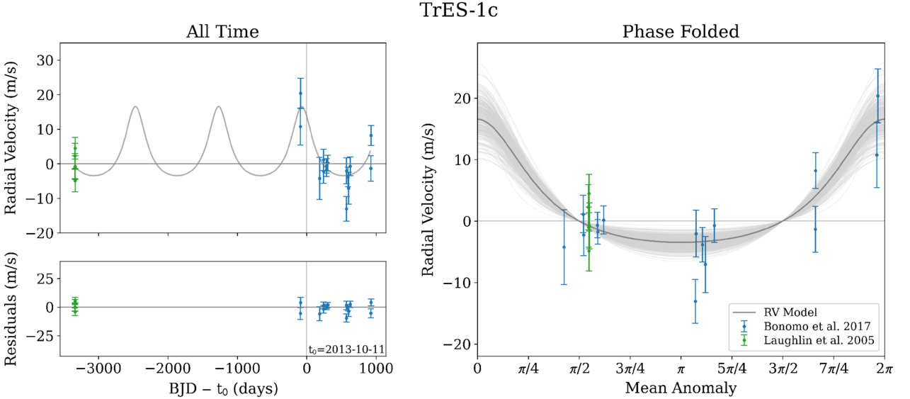 RV residuals (see Figure 3) and best-fit orbital model for the proposed planetary companion TrES-1 c. Top left: RV measurements over time, with data points shifted by the systemic RV and observation times shifted to the reference time, t0. Bottom left: residuals obtained by subtracting the best-fit RV model from the data. Right: phase-folded RV measurements plotted against mean anomaly, with 300 random samples from the model posterior shown in gray to represent model uncertainty. Data sources are color coded as indicated in the legend.